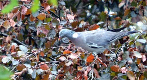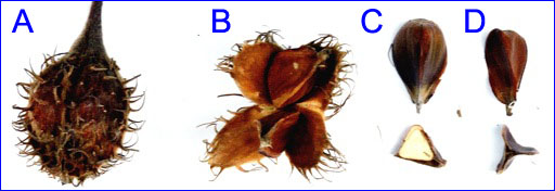 | Ce pigeon ramier perché sur l'extrémité des rameaux attrape des faines. Ces akènes, fruit du hêtre, logées par deux ou trois dans une cupule ligneuse garnie de barbes très raides (A) murissent avant les glands. L'enveloppe s'ouvre (B), les faines (C) se détachent progressivement, elles ne sont pas encore séchées et relativement tendres, le ramier les avale entières. Par mètre cube, le hêtre produit environ 500 faines pleines (C) et 250 vides (D) |