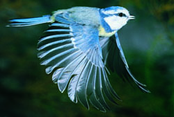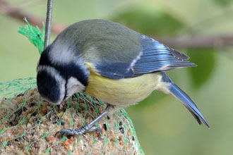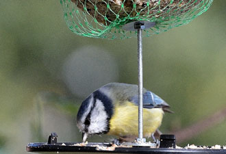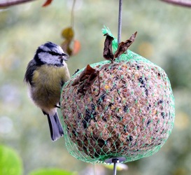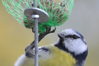 C'est la fin, désolidarisée de la tige métallique ce qui reste de la boule devient peu stable cependant la mésange bleue parvient encore à s'y accrocher . |