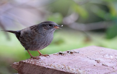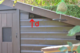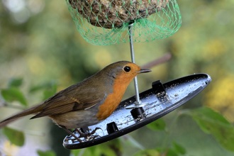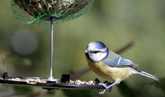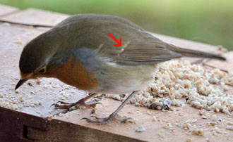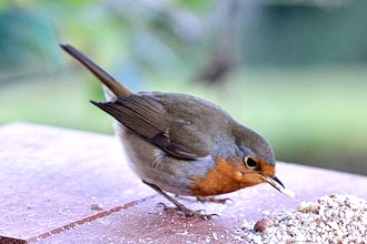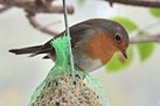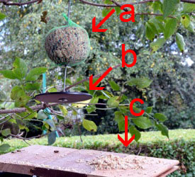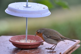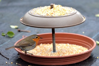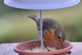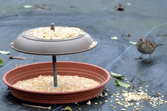| En cette deuxième quinzaine s'octobre la pluie fréquente dégrade rapidement les arachides moulues. Il est bon de les disposer dans un plateau surmonté d'une "toiture" ce qui ne perturbe absolument pas le rougegorge déjà bien habitué. Ce plateau sera mis à sa disposition dès que la météo lui permet de se déplacer. | La piste d'atterrissage réussit à ce hardi moineau. La boule de graisse enfilée sur un tige métallique ne tombe pas au fond du filet ce qui lui facilite l'accrochage | |