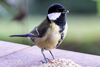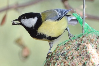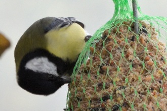 une mésange charbonnière s'est présentée à la boule de graisse et aux arachides moulues |