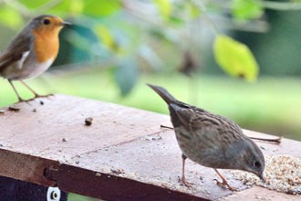désarçonne. Une manière plus élégante consiste à lui proposer du maïs concassé. Le rougegorge curieux montre le chemin (20) mais ne s'y attarde pas, il préfère les arachides. Prudemment un moineau le suit (21) bientôt ils seront plusieurs à préférer se nourrir au sol selon leurs habitudes |